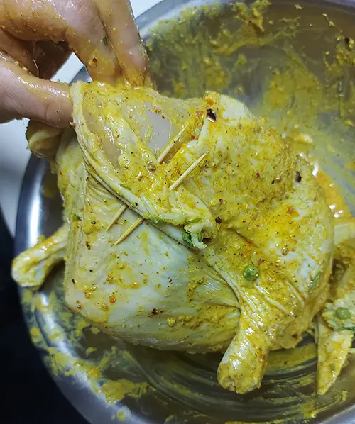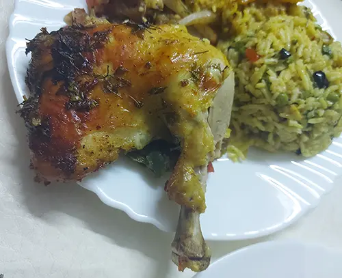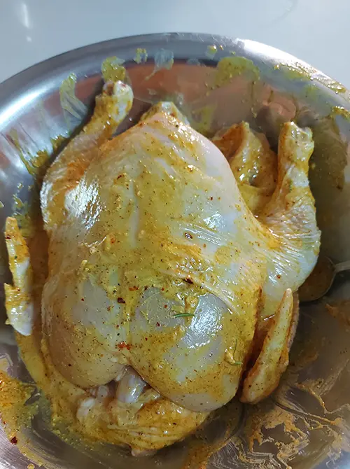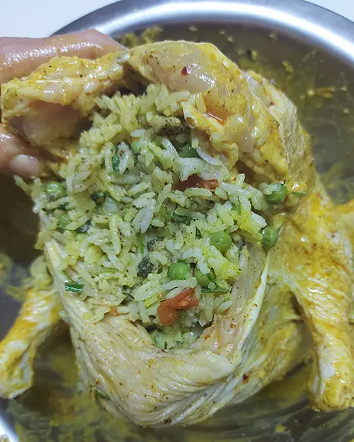 Ce poulet farci au riz parfumé est une recette complète, savoureuse et facile à réaliser. La viande est longuement marinée à la moutarde, au yaourt et aux épices, ce qui lui apporte une texture tendre et un goût délicat. La farce à base de riz, de légumes et d’olives équilibre parfaitement le plat.