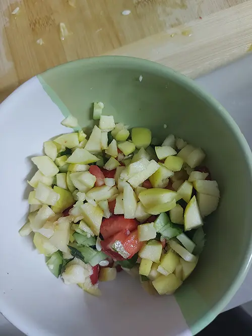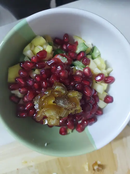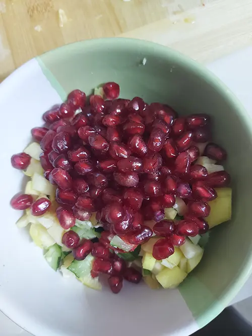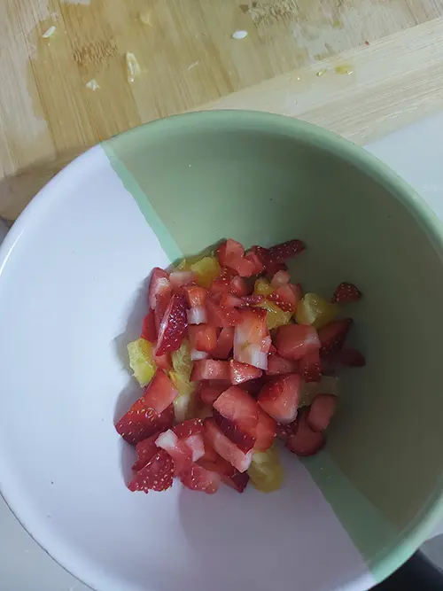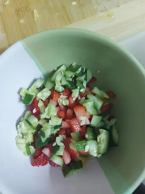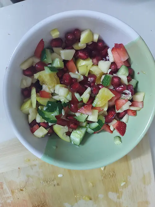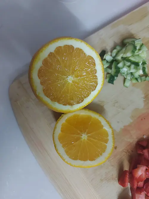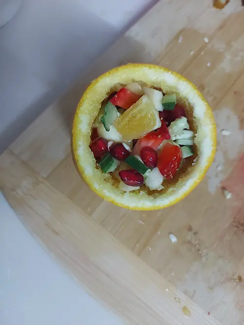 Cette salade de fruits réunit des ingrédients simples et de saison pour un résultat frais et coloré. Elle associe le croquant du concombre, la douceur des fraises et de la pomme, l’acidulé de la grenade et le côté gourmand des dattes. L’orange apporte du jus naturel et sert aussi d’écrin pour une présentation élégante en coque. Cette recette sans sucre ajouté convient au dessert comme au goûter léger.